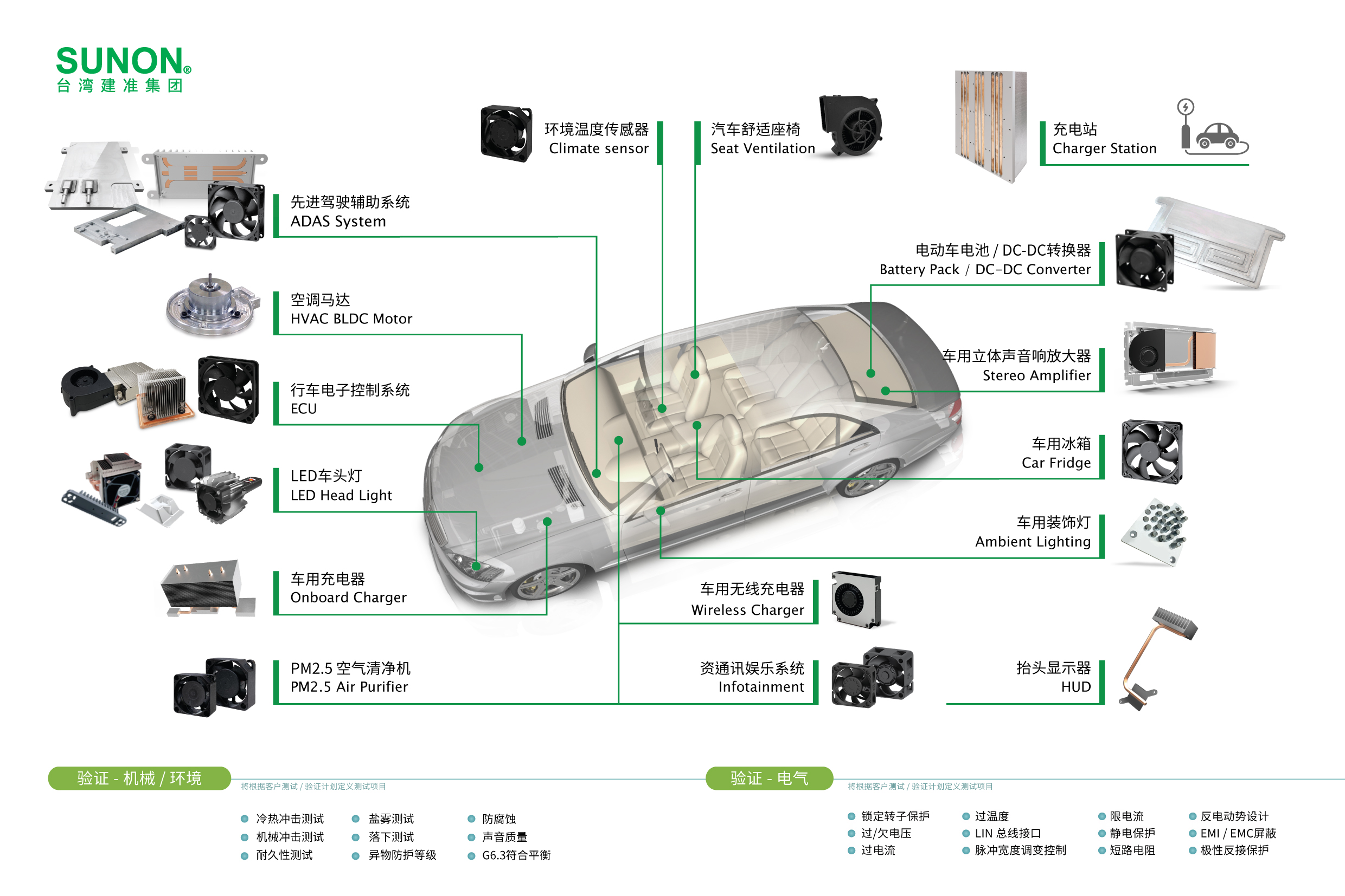 不良的散熱設計將嚴重危及電子產(chǎn)品的可靠度、安全性、耐久性,也會在行駛中產(chǎn)生不良的噪音與振動,進而影響汽車制造商的產(chǎn)品保固維修與汽車質(zhì)量滿意度等問題。SUNON以獨創(chuàng)DR MagLev防阻微塵磁浮馬達風扇技術,結(jié)合高安全性、高可靠度、高效能產(chǎn)品特色,并通過耐酸、耐鹽霧GR487驗證、1000沙漠地區(qū)測試、ESD 靜電防護等嚴苛測試,滿足客戶高質(zhì)量的要求